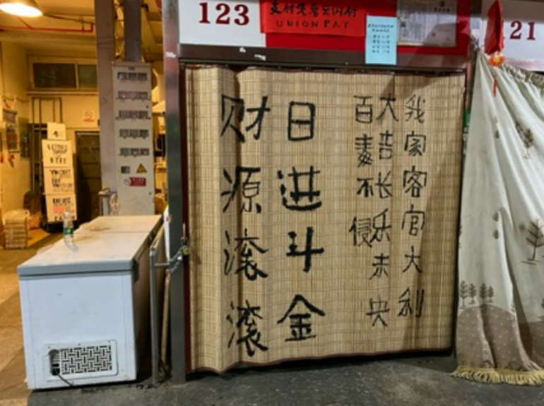 如果你此時走進三源里菜市場,還能看到一場藝術(shù)展覽的“遺跡”。在某些攤位的卷簾門上、售賣的貨物標簽上,還有些毛筆寫的書法作品。