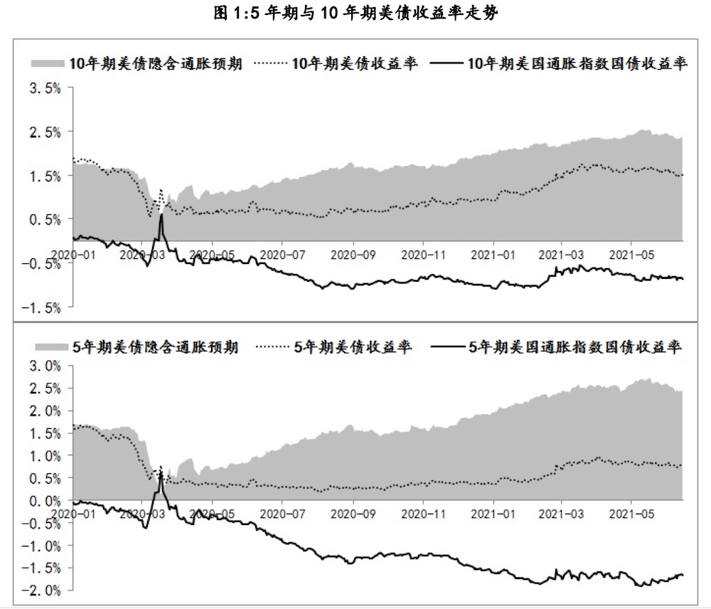 按照“美債收益率 = 通脹指數(shù)國債收益率(TIPS) + 通脹預(yù)期”的邏輯,分別對美債收益率一季度的上行和二季度的調(diào)整進(jìn)行分解后,發(fā)現(xiàn)代表經(jīng)濟(jì)增長前景的TIPS對10年美債收益率的影響更大一些,而5年期美債收益率的變化更多源自通脹預(yù)期的變化,即美債收益率反映出典型的經(jīng)濟(jì)復(fù)蘇特征,中期的通脹預(yù)期和長期的增長前景。