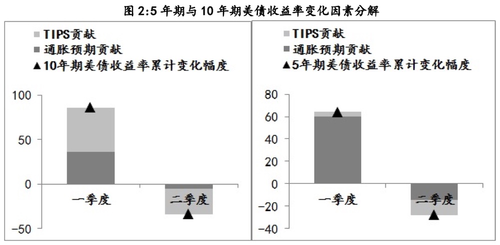 再例如,一季度5年美債收益率上行的64BPs中,通脹預(yù)期貢獻(xiàn)了60BPs,TIPS只貢獻(xiàn)了4BPs;而二季度回落的28BPs中,通脹預(yù)期貢獻(xiàn)了15BPs,另外13BPs來自TIPS。