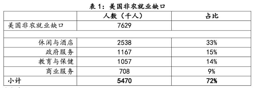 但由于本次疫情對于經(jīng)濟(jì)的外生沖擊具有明顯的“非對稱性”,因此在經(jīng)濟(jì)復(fù)蘇階段,服務(wù)業(yè)的修復(fù)始終被疫情羈絆。例如,截至目前,美國非農(nóng)就業(yè)市場仍有762.9萬的缺口,其中有70%以上的缺口集中在休閑和酒店、政府服務(wù)、教育和保健以及商業(yè)服務(wù)等領(lǐng)域,這些領(lǐng)域就業(yè)的修復(fù)直接取決于人員自由流動的恢復(fù)情況。