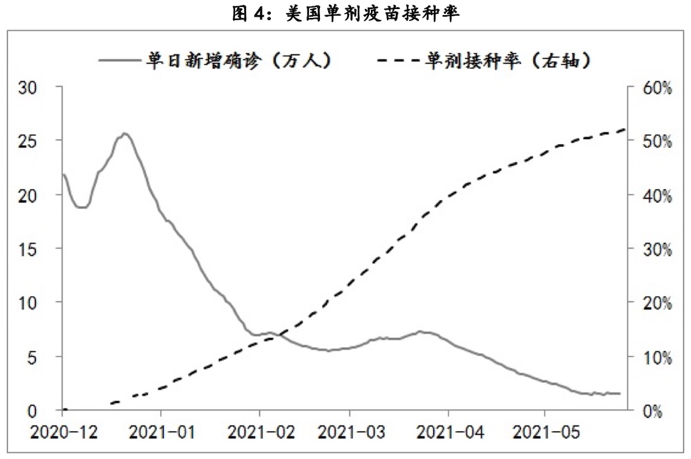 因此,二季度美債收益率之所以與美國實(shí)際通脹水平發(fā)生脫節(jié),主因在于就業(yè)市場修復(fù)速度不及市場預(yù)期,但進(jìn)入6月份,美國單劑疫苗接種率已超過50%(目前是52.1%),已經(jīng)有希望最終實(shí)現(xiàn)“群體免疫”,同時其單日新增確診病例由年初的25萬人以上,降至1.5萬人。因此,就業(yè)修復(fù)相對緩慢的幾個重點(diǎn)服務(wù)業(yè)領(lǐng)域,后期的修復(fù)速度有望提速,相應(yīng)美債收益率也會擺脫目前橫盤的態(tài)勢,復(fù)歸上行趨勢。