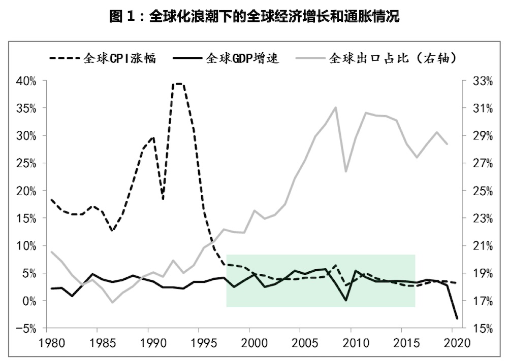 自上世紀(jì)70年代以來,全球曾經(jīng)歷過長達(dá)20多年高通脹的沖擊,1973年至1995年期間,全球通脹平均漲幅近15%,而在上世紀(jì)80年代后期至90年代中期期間,全球已經(jīng)轉(zhuǎn)入惡性通脹,CPI漲幅一度接近40%。只有貿(mào)易全球化在全球范圍內(nèi)得到廣泛共識,此狀況才得以扭轉(zhuǎn)。時間點(diǎn)是1995年前后,WTO正是1995年開始運(yùn)作,標(biāo)志著貿(mào)易全球化規(guī)則已在全球范圍內(nèi)推行,相應(yīng)全球出口占GDP比重由1995年的20%持續(xù)提升至30%以上,而全球經(jīng)濟(jì)也被帶入高增長和低通脹并行的緩和期,期間全球通脹水平逐漸回落并穩(wěn)定在3%左右,全球經(jīng)濟(jì)則始終保持著3-5%的平均增長狀態(tài)。