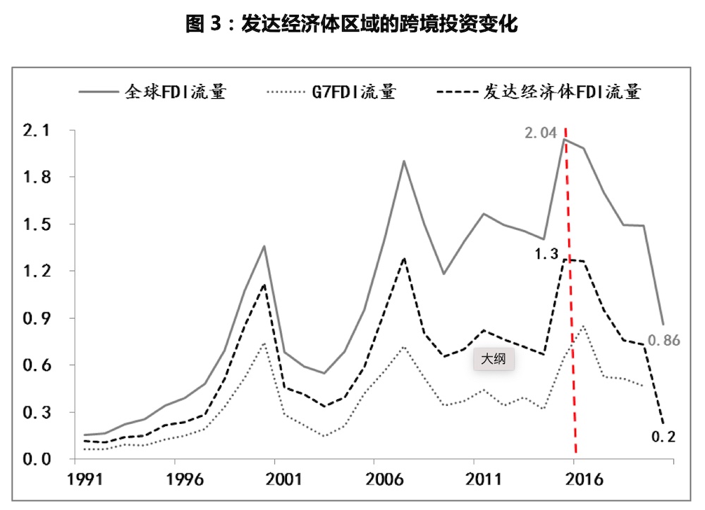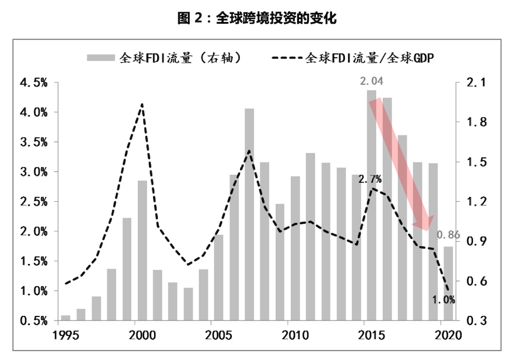 對應(yīng)著,全球FDI流量出現(xiàn)了趨勢性下降,去年在疫情沖擊下,更是跌落至萬億美元以下,僅有8600億美元,而以G7國家為代表的發(fā)達(dá)經(jīng)濟(jì)體區(qū)域的FDI,更是由1.3萬億美元驟降至2000億美元。與此同時,貿(mào)易全球化進(jìn)程開始逆轉(zhuǎn),全球出口占GDP比重不僅停止上升趨勢,并且已經(jīng)由30%的峰值開始緩慢下降。