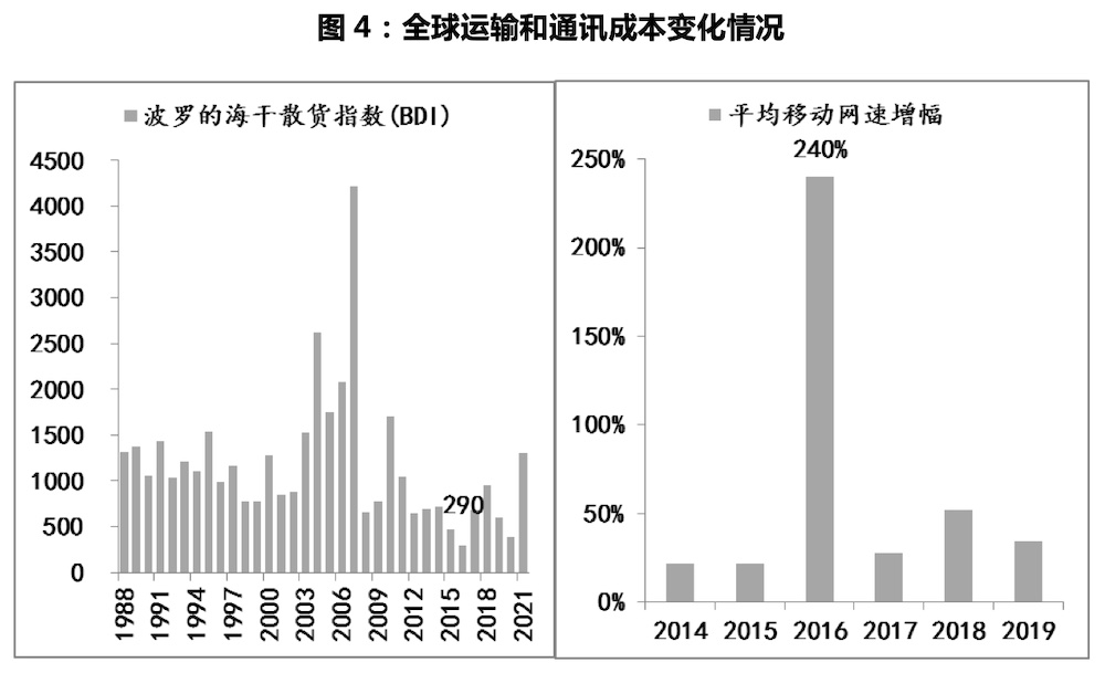 首先,全球化所需的運(yùn)輸和通信成本開始抬升。代表全球運(yùn)輸成本的波羅的海干散貨指數(shù)在2016年降至最低的290之后,開始出現(xiàn)趨勢性回升,今年已經(jīng)升至3400以上的水平,今年上半年平均在2300附近,已經(jīng)大幅超出上世紀(jì)90年代中期至2008年全球金融危機(jī)期間的平均水平。另外,全球移動網(wǎng)速在經(jīng)歷4G時代提速之后,自2016年之后,平均網(wǎng)速的增幅也出現(xiàn)了放緩勢頭,而歐美等發(fā)達(dá)經(jīng)濟(jì)體對中國華為推動的5G的抵觸以及5G本身的原因,使得全球通訊成本很難在短期內(nèi)進(jìn)一步大幅下降。
