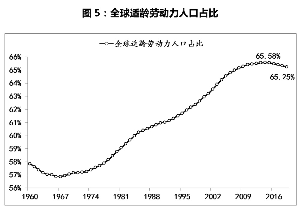 其次,勞動力成本開始上升。人口紅利的集中釋放是國際資本進(jìn)行全球布局很重要的原因,但此因素在2014年就已經(jīng)出現(xiàn)了拐點(diǎn)性變化。全球15-64歲的適齡勞動力的人口占比于2014年升至65.58%峰值之后,開始趨勢性回落,2019年已降至65.25%,五年間累計下降了0.33%;同期65歲以上人口占比的老齡化程度,則由2014年的8.05%升至9.1%。2014年前,適齡勞動力比重的提升保證了國際資本能夠很容易獲得充足的便宜的勞動力,而人口紅利的衰減,再疊加老齡化的加重,均會影響到國際資本全球化布局的勞動力成本