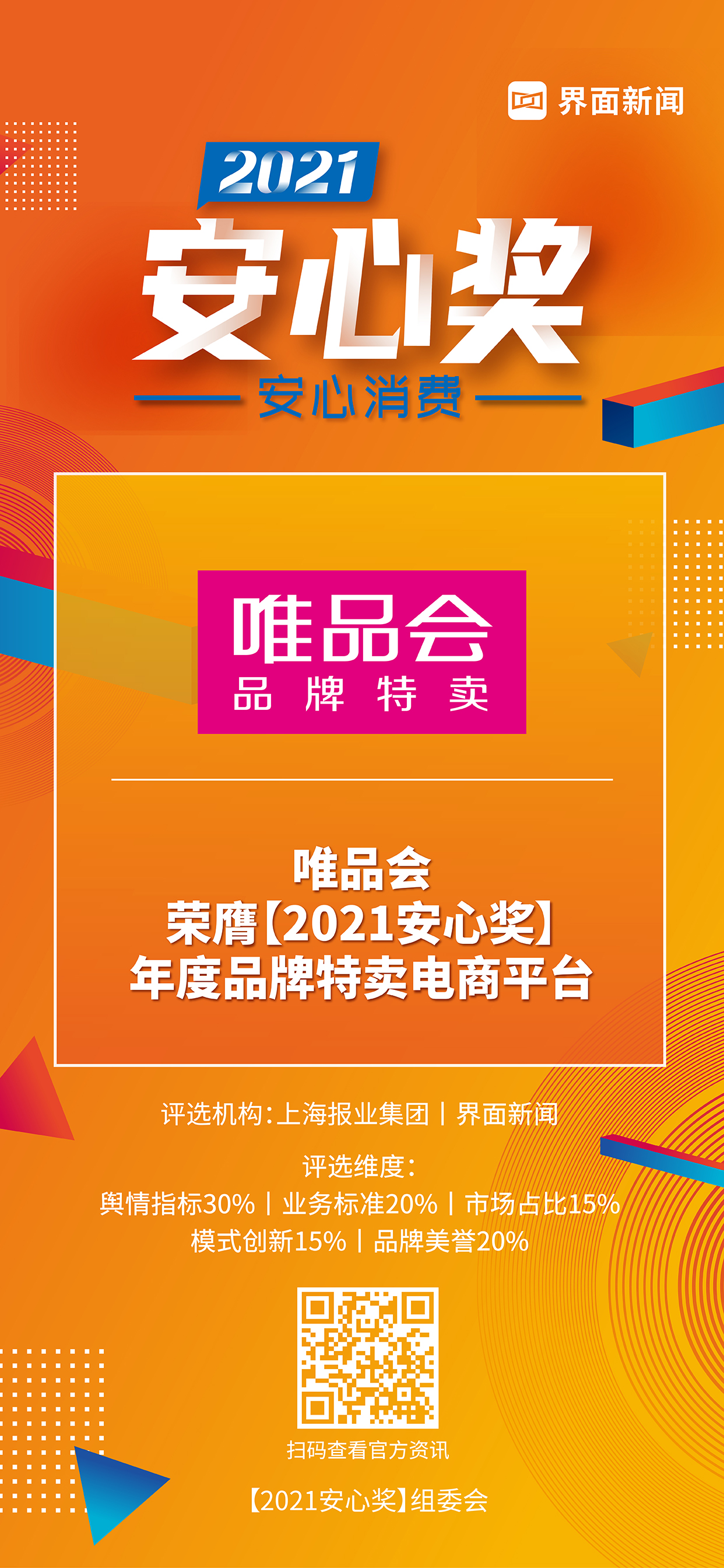 8月5日,上海報(bào)業(yè)集團(tuán)|界面新聞在上海靜安瑞吉酒店舉辦了【2021安心獎(jiǎng)】頒獎(jiǎng)典禮,并正式公布了本年度獲獎(jiǎng)名單。圍繞“安心消費(fèi)”這一核心價(jià)值,來自生活服務(wù)、家電、家化、美妝護(hù)膚、食品、乳品、飲品等領(lǐng)域優(yōu)秀企業(yè),突破重圍,斬獲年度大獎(jiǎng)Top40。唯品會(huì)以其開拓創(chuàng)新精神和始終以用戶至上的原則,榮膺年度品牌特賣電商平臺(tái)。