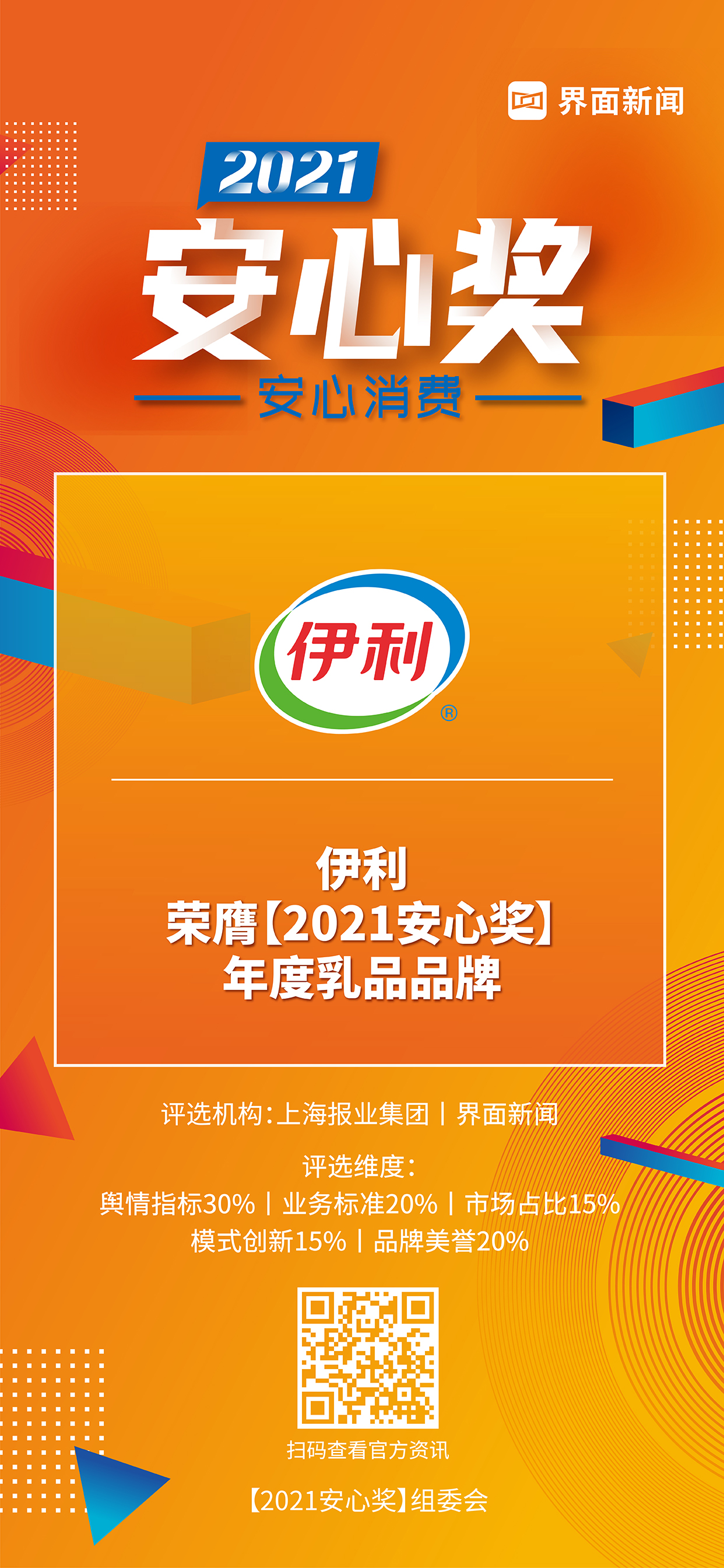 8月5日,上海報(bào)業(yè)集團(tuán)|界面新聞在上海靜安瑞吉酒店舉辦了【2021安心獎(jiǎng)】頒獎(jiǎng)典禮,并正式公布了本年度獲獎(jiǎng)名單。圍繞“安心消費(fèi)”這一核心價(jià)值,來(lái)自生活服務(wù)、家電、家化、美妝護(hù)膚、食品、乳品、飲品等領(lǐng)域優(yōu)秀企業(yè),突破重圍,斬獲年度大獎(jiǎng)Top40。益伊利以其一貫的綠色發(fā)展理念和用行動(dòng)踐初心的擔(dān)當(dāng),榮膺年度乳品品牌大獎(jiǎng)。