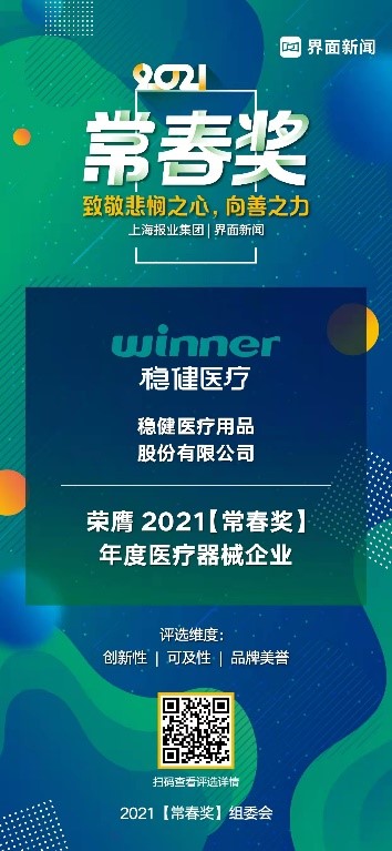 11月16日,上海報(bào)業(yè)集團(tuán)l界面新聞揭曉 2021【常春獎(jiǎng)】終榜,正式公布了本年度獲獎(jiǎng)名單。聚焦大健康行業(yè)的升級(jí)和變化,綜合社會(huì)各界的意見(jiàn)與建議,來(lái)自制藥、醫(yī)療器械、藥品銷售、醫(yī)療服務(wù)、健康管理、健康金融等領(lǐng)域的31家企業(yè)奪得了年度大獎(jiǎng)。穩(wěn)健醫(yī)療用品股份有限公司憑借其醫(yī)療及消費(fèi)的協(xié)同發(fā)展榮膺年度醫(yī)療器械企業(yè)。