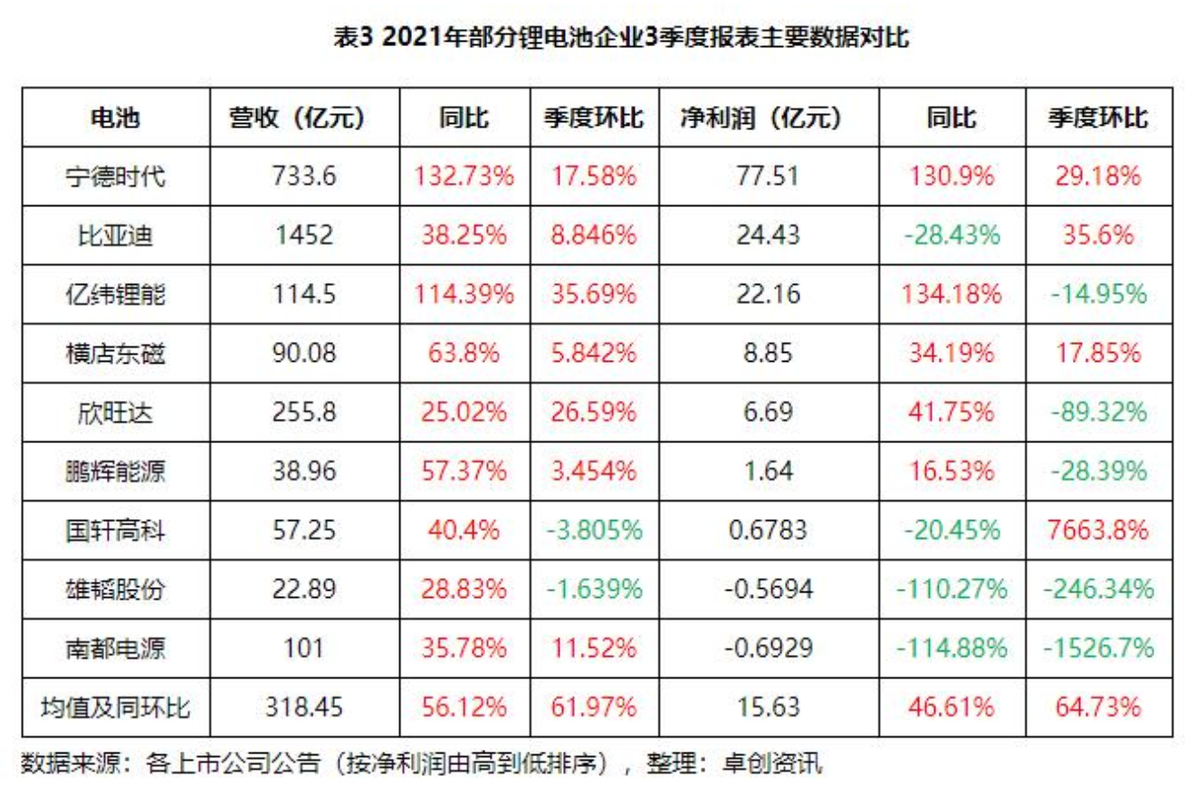 據(jù)卓創(chuàng)資訊數(shù)據(jù)統(tǒng)計(jì),今年第三季度,在原材料價(jià)格大幅上漲,產(chǎn)品毛利率下降的情況下,國(guó)內(nèi)部分鋰電池企業(yè)凈利潤(rùn)表現(xiàn)有所下滑。