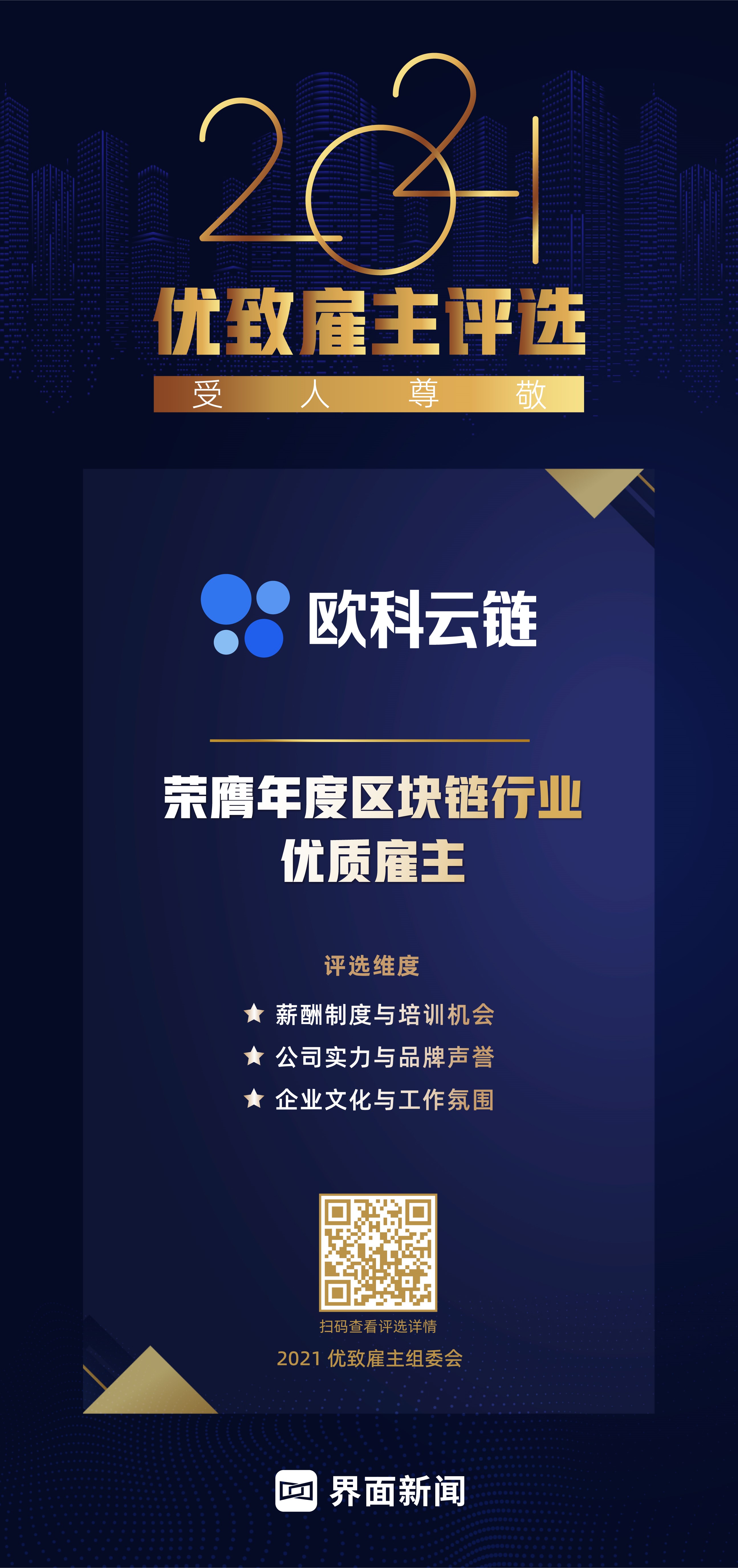 12月15日,上海報業(yè)集團(tuán)l界面新聞在上海前灘香格里拉酒店舉辦了2021【優(yōu)致雇主】頒獎典禮,并正式公布了本年度獲獎名單。圍繞尋找和評選最佳雇主這一責(zé)任旨?xì)w,以獨立客觀立場,通過專業(yè)科學(xué)的調(diào)查和評估體系,洞察求職者的需求變化,同時為求職者發(fā)現(xiàn)“好雇主”提供有效參考,實現(xiàn)雇主與雇員的“雙贏”,各行各業(yè)的優(yōu)秀企業(yè)均踴躍參加。歐科云鏈憑借創(chuàng)新的人才管理模式,榮膺2021年度區(qū)塊鏈行業(yè)優(yōu)致雇主。