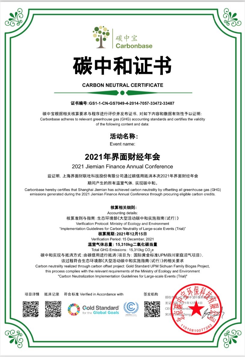 碳中寶為第四屆界面財(cái)經(jīng)年會(huì)頒發(fā)的碳中和證書  圖片由活動(dòng)主辦方提供