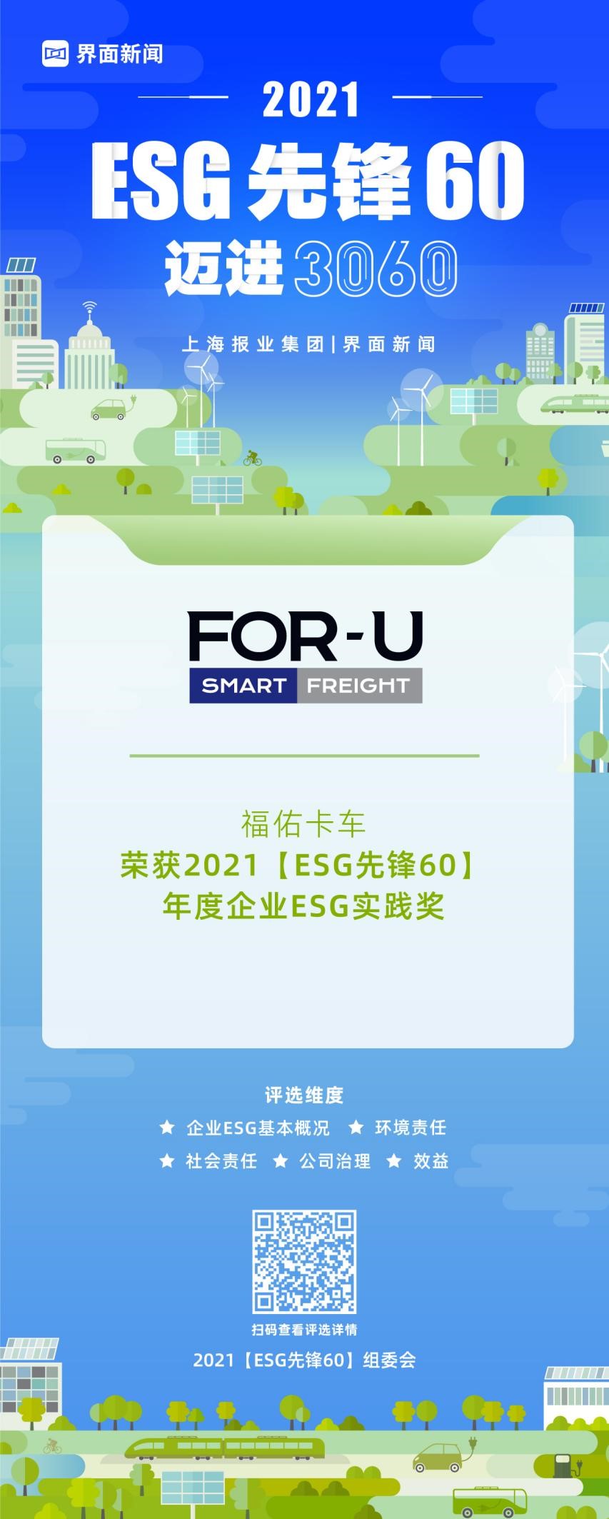 12月15日,上海報業(yè)集團|界面新聞在上海前灘香格里拉舉辦了2021【ESG先鋒60】頒獎典禮,并正式公布了本年度獲獎名單。在這項萬眾期待的關于ESG議題的年度評選中,來自各行各業(yè)的50家綠色先鋒企業(yè)與10位先鋒探索人物,憑借年度市場表現(xiàn)與行業(yè)影響力,獲得年度大獎。其中,福佑卡車憑借其在行業(yè)內的優(yōu)異表現(xiàn),榮膺年度企業(yè)ESG實踐獎。