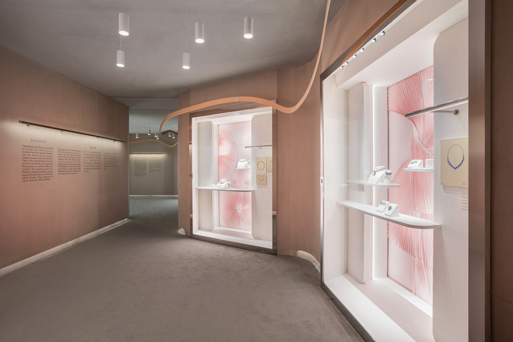 而展覽空間內(nèi)優(yōu)雅的緞帶褶皺則貼合了梵克雅寶在一戰(zhàn)后以緞帶、絲綢等柔軟的織物為靈感,設(shè)計(jì)的一系列貼合身體韻律動(dòng)感的高級(jí)珠寶藝術(shù)作品。