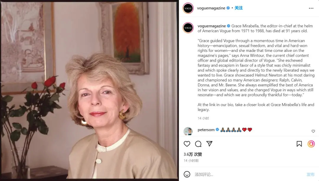 2021年12月23日,于1971年至1988年擔(dān)任美國版《Vogue》主編的 Grace Mirabella 去世,享年91歲。