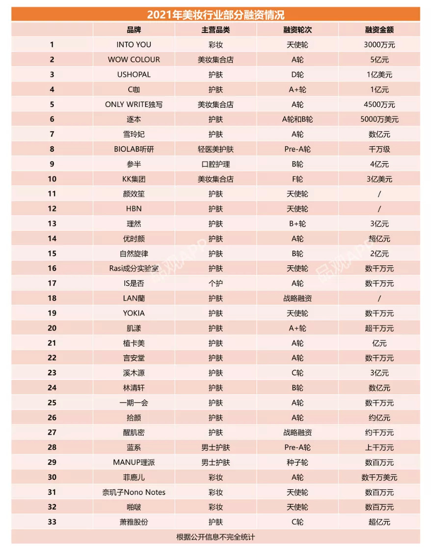 其中,理然、C咖、ONLY WRITE獨(dú)寫等化妝品品牌和零售店,都在年內(nèi)完成了至少2輪融資。KK集團(tuán)于7月完成的約3億美元(約合人民幣19.39億元)F輪融資,則是國(guó)內(nèi)美妝行業(yè)今年以來(lái)金額最大的一筆融資。