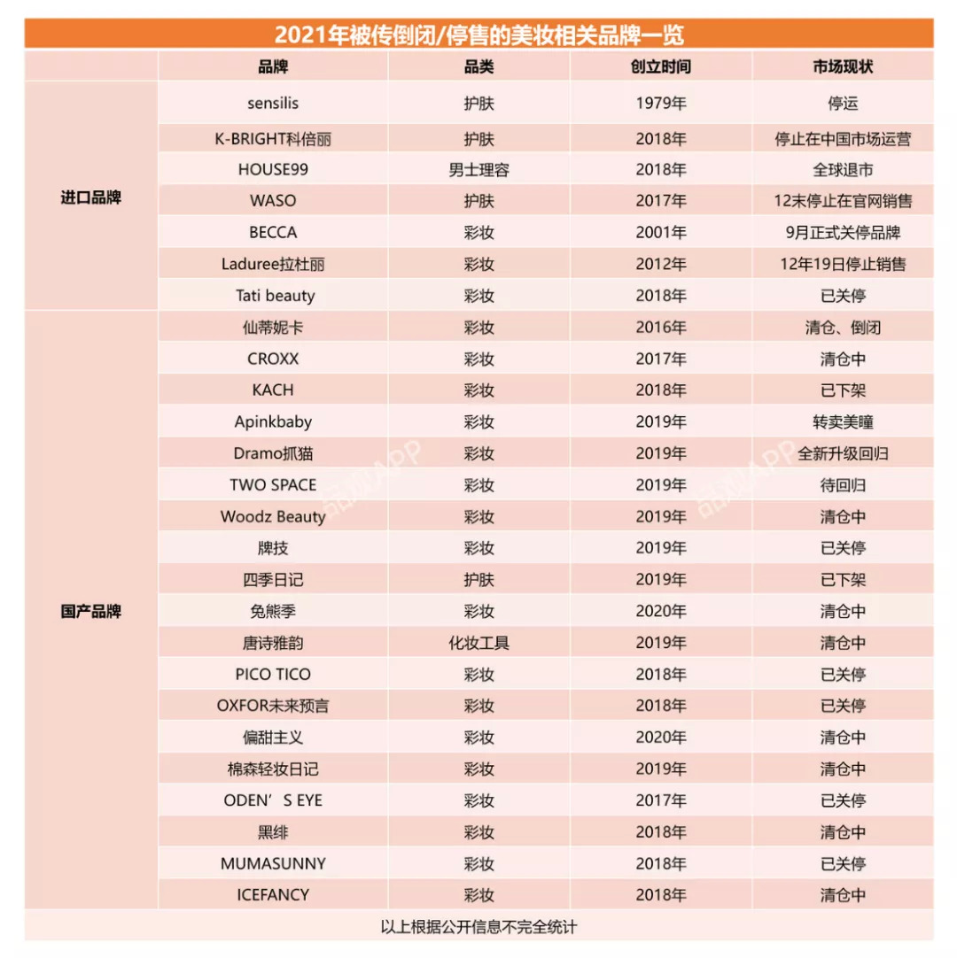 自進(jìn)入2021年以來(lái),國(guó)內(nèi)外化妝品品牌關(guān)停、清倉(cāng)等消息頻頻傳出。據(jù)化妝品觀察不完全統(tǒng)計(jì),截至12月,被傳出關(guān)停、倒閉的美妝品牌已有26個(gè),其中大部分為國(guó)貨彩妝品牌,且大多品牌生命周期并不長(zhǎng)。