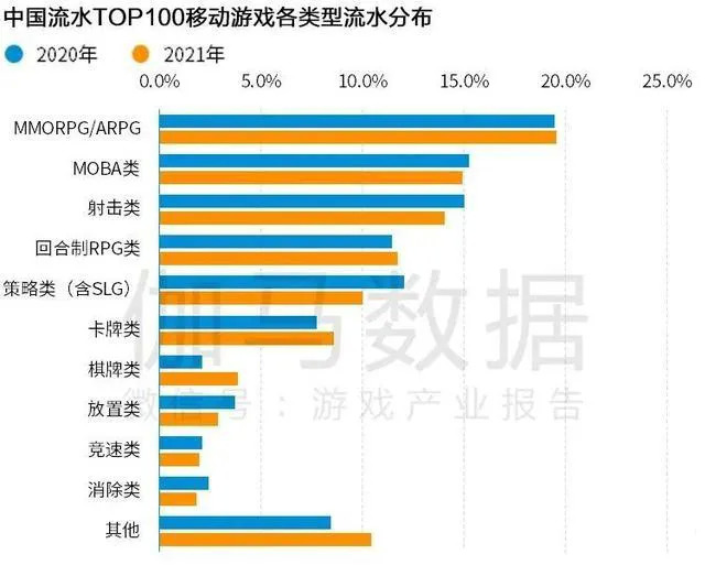 以國內(nèi)市場占比最高的RPG品類為例。伽馬數(shù)據(jù)顯示2021年TOP200手游里,MMORPG/ARPG品類占比第一,接近40%,網(wǎng)易一直是這一品類的霸主,七麥數(shù)據(jù)顯示,國內(nèi)頭部MMORPG流水收入排名中,網(wǎng)易上榜四款,新游戲《天諭》和老游戲《倩女幽魂》《明日之后》《一夢江湖》的新老矩陣已經(jīng)成型,騰訊只有《天涯明月刀》和《全民奇跡2》上榜,雖然天刀收入在這一品類排行第一,但騰訊整體未形成游戲矩陣,后勁不足;
