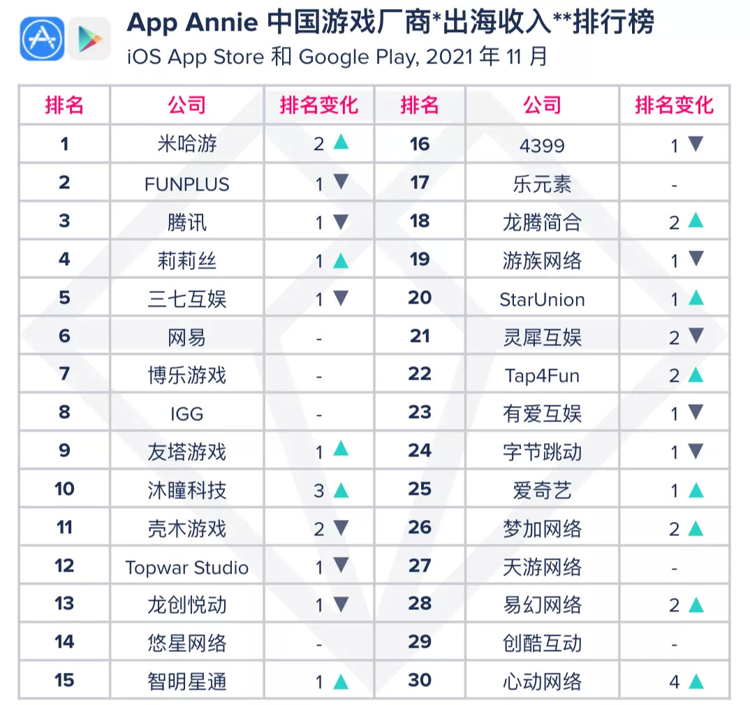12月17日,App Annie 公布了11 月游戲廠商出海收入榜單。米哈游擊敗FUNPLUS重回榜單第一,報(bào)告認(rèn)為“豐富的產(chǎn)品線與全球發(fā)行策略配合良好,Tier-1 國家營收表現(xiàn)穩(wěn)定。”