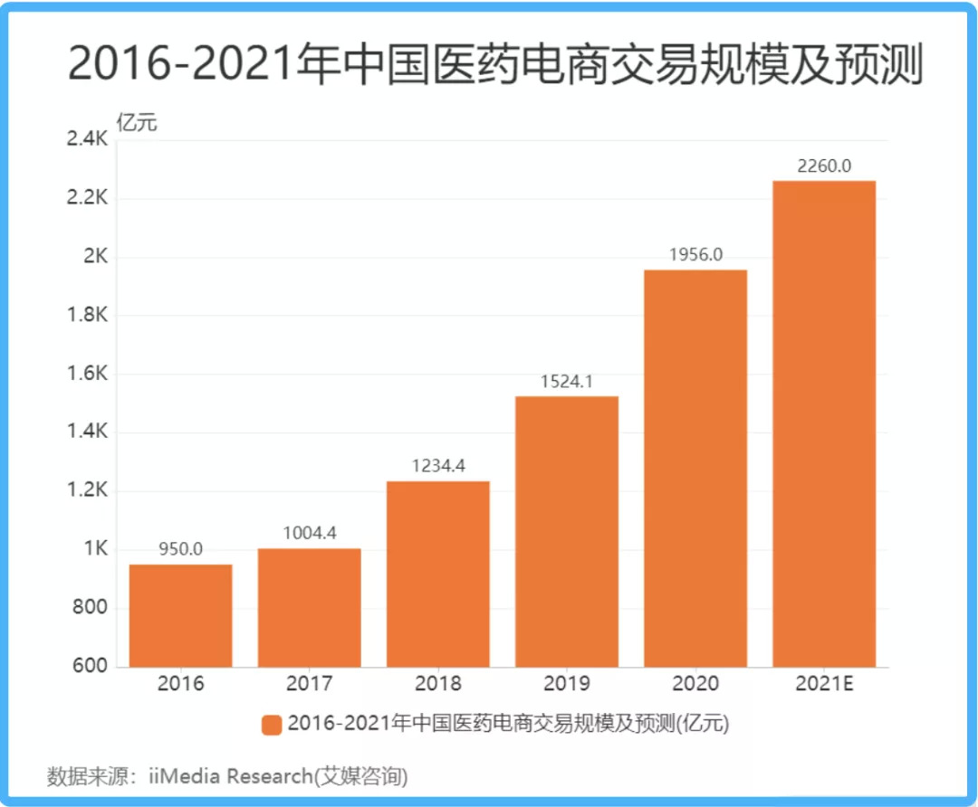 iiMedia Research(艾媒咨詢)數(shù)據(jù)顯示,2016-2020年,中國醫(yī)藥電商交易規(guī)模從950億元增長至1956億元,四年時(shí)間漲了一倍多,預(yù)計(jì)2021年將達(dá)2260億元。