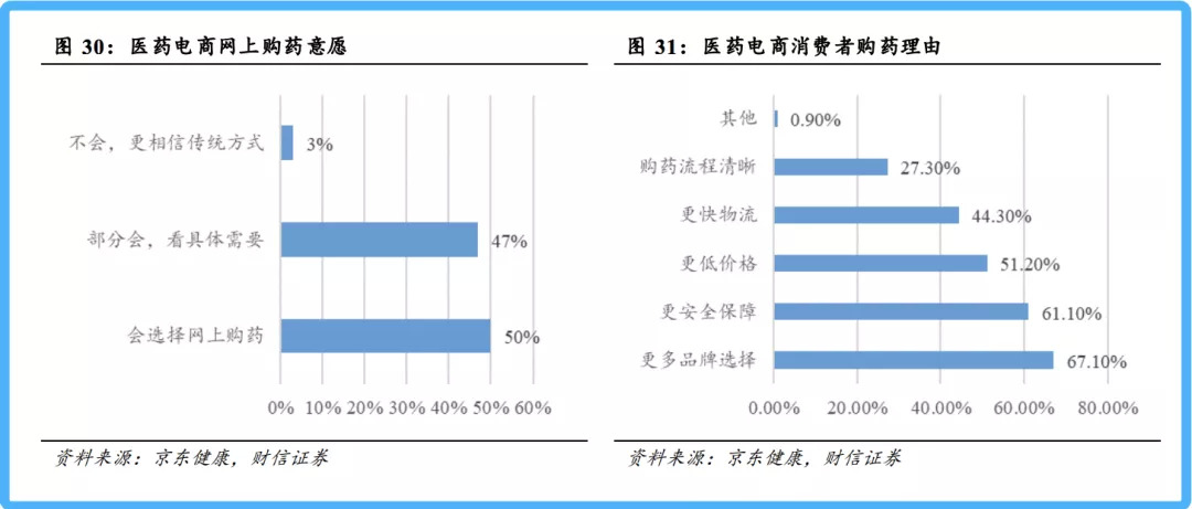財(cái)信證券研報(bào)顯示,97%的調(diào)查者會(huì)或者部分會(huì)選擇在網(wǎng)上購藥,其選擇網(wǎng)上購藥的理由主要為品牌選擇多(67.10%)、安全保障高(61.10%)、價(jià)格低(51.20%)。
