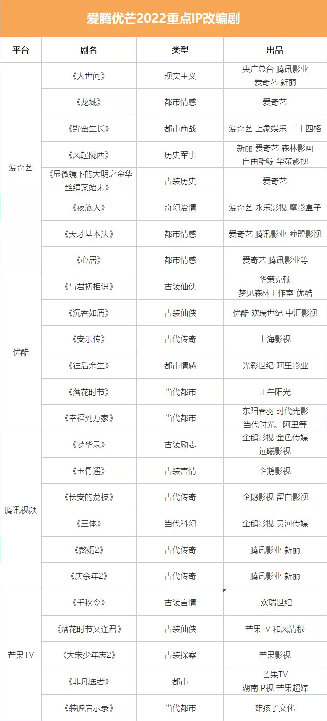 但值得注意的是,四家的2022劇集片單中都存在不少“老面孔”,且多為頭部?jī)?nèi)容,典型如《冰雨火》《繁花》《人生若如初見(jiàn)》《四十正好》《尚食》。