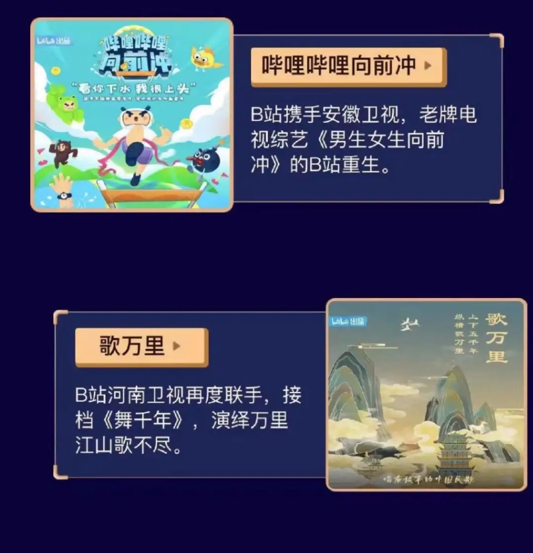 另一邊,B站將在今年繼續(xù)牽手河南衛(wèi)視推出新的國(guó)風(fēng)綜藝《歌萬(wàn)里》,與安徽衛(wèi)視合力推進(jìn)老牌電視綜藝《男生女生向前沖》的網(wǎng)絡(luò)重生,打造《嗶哩嗶哩向前沖》。