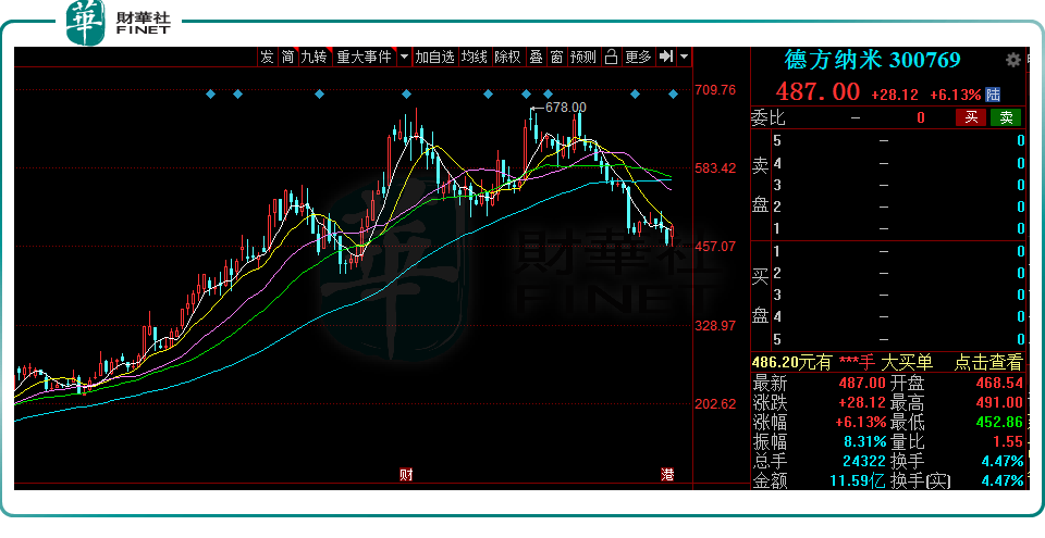 2022年1月6日,德方納米大漲6.13%,股價487元,目前最新總市值為434.5億元。