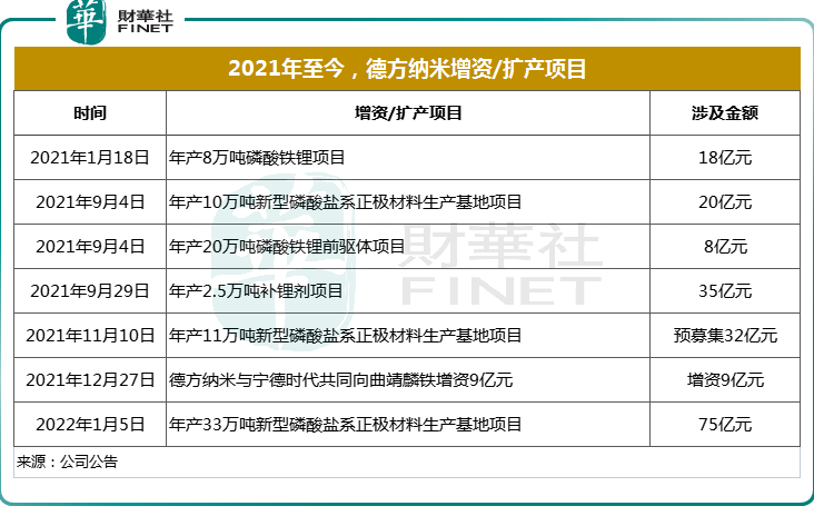 2022年1月5日,磷酸鐵鋰正極材料龍頭德方納米(300769.SZ)公告宣布,公司擬在曲靖經(jīng)濟技術(shù)開發(fā)區(qū)建設“年產(chǎn)33萬噸新型磷酸鹽系正極材料生產(chǎn)基地項目”,項目總投資約75億元。