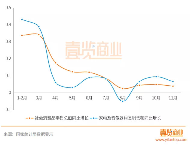 國家統(tǒng)計(jì)局?jǐn)?shù)據(jù)顯示,2021年1—11月份,社會(huì)消費(fèi)品零售總額399554億元,同比增長(zhǎng)13.7%,家電和音像器材類行業(yè),在此期間同比2020年增長(zhǎng)12.2%、同比2019年增長(zhǎng)約2.5%。此前受疫情影響大幅下降的家電領(lǐng)域,在2021年開始回溫。