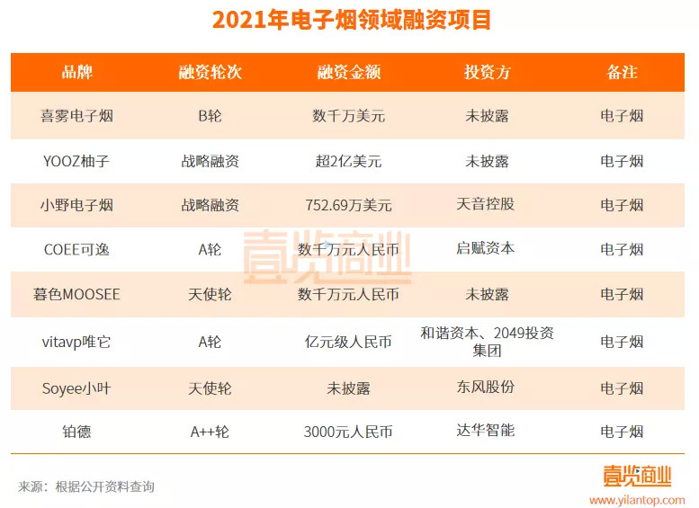據(jù)壹覽商業(yè)統(tǒng)計(jì),2021年有8家電子煙品牌獲得融資,融資金金額超17億元人民幣,除一件未披露資金的融資外,其余都是千萬級(jí)別的融資事件。其中,僅YOOZ柚子一個(gè)品牌融資金額就超2億美元。