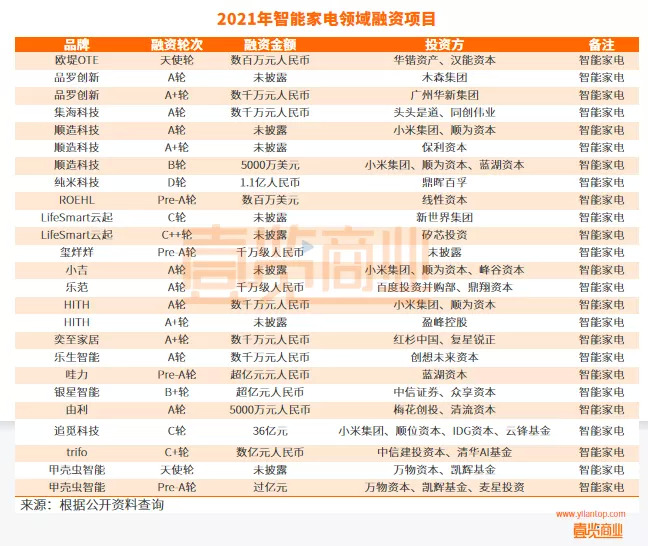 其他相關(guān)企業(yè)如品羅創(chuàng)新、LifeSmart云起、順造科技、HITH品牌在2021年均獲得2-3次融資,金額從數(shù)千萬到上億元不等。