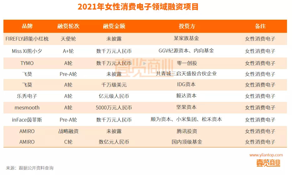 據(jù)壹覽商業(yè)統(tǒng)計(jì),2021年中包含Miss Xi熊小夕、飛莫、AMIRO、TYMO、mesmooth等9個(gè)女性小家電品牌獲得融資,融資金額超6億元。其中,美容儀類目最受歡迎,融資事件占6起。