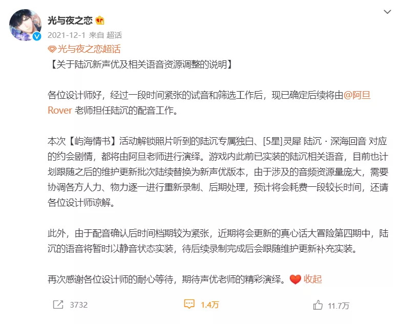 “我感覺(jué)也沒(méi)那么差啊,磨合一段就好了唄?!惫俜綄?duì)玩家行為并未作出回應(yīng),胡桃跟其他玩家一樣,覺(jué)得官方是在冷處理,過(guò)了這陣就好了。沒(méi)想到12月29日,官微突然發(fā)文,稱(chēng)阿旦所屬工作室違反保密協(xié)議,《光夜》終止與阿旦的合作關(guān)系,并尋找新CV。