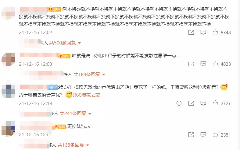 因?qū)π翪V不滿,陸夫人開(kāi)始整齊劃一地在評(píng)論區(qū)、超話維權(quán)。但官方顯然也不愿意才找到新CV就換人,因此并未迅速作出回應(yīng)?!氨仨氉尡睒O光意識(shí)到事情的嚴(yán)重性”,作為新CV的阿旦首當(dāng)其沖承擔(dān)了玩家的怒火,部分“陸夫人”在他的個(gè)人微博及所屬配音工作室微博下怒罵,稱(chēng)他水平太差毀了陸沉。