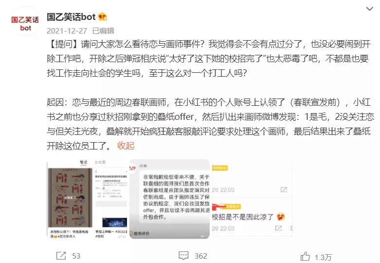 畫(huà)師若違反規(guī)定固然有錯(cuò),但在舉報(bào)弄掉別人飯碗后,幸災(zāi)樂(lè)禍地說(shuō)一句“她校招涼了吧”,也實(shí)在令人齒冷。這樣的故事不是個(gè)例,在乙游圈子里,發(fā)動(dòng)群眾力量踢翻某個(gè)打工人的工作并不罕見(jiàn),當(dāng)然,誰(shuí)也不覺(jué)得自己錯(cuò)了。