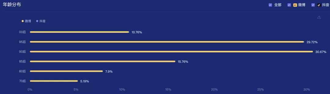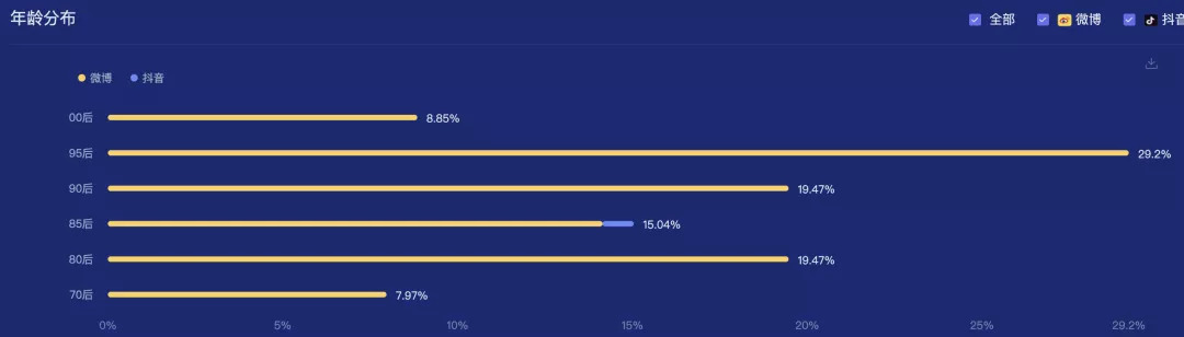 從社交平臺的品牌人群畫像上來看,「QQ飛車手游」和「藍翔職業(yè)技術(shù)學(xué)?!狗劢z的年齡分布都主要集中在95后,有很大的用戶年齡層重合度;除了95后,「QQ飛車手游」更集中在90后粉絲,而「藍翔職業(yè)技術(shù)學(xué)校」則集中在80后。受眾年齡層的年輕化,是這次兩者合作,在社交平臺上破圈的助推力。