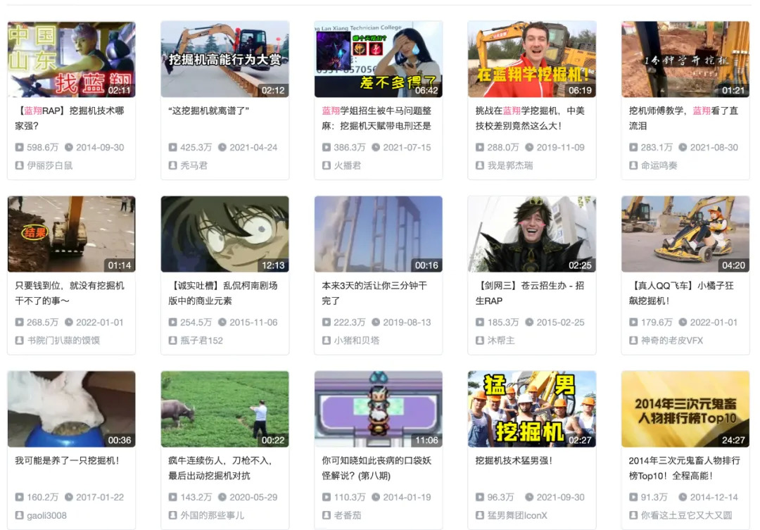 從內(nèi)容二次創(chuàng)作傳播角度看,90 后、00 后本身對詼諧有趣的互聯(lián)網(wǎng)文化有著較強的接受能力,比如在 B 站搜索「藍翔」,你就會發(fā)現(xiàn),「藍翔」已經(jīng)不是一個職業(yè)技術(shù)學(xué)校的名稱,「挖掘機」是鬼畜區(qū)重要的創(chuàng)意素材。