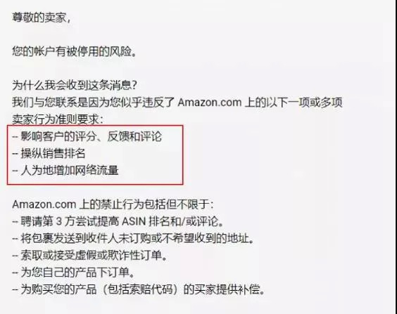 上述論斷或許不是空穴來(lái)風(fēng)。2021年4月,亞馬遜對(duì)超5萬(wàn)中國(guó)賣家封號(hào),即使頭部店鋪也沒(méi)能幸免,有的店鋪被扣資金高達(dá)2億人民幣。而在封禁之前,這些店鋪都接到過(guò)亞馬遜的警示郵件,其中就提到了賣家的“刷好評(píng)行為”。