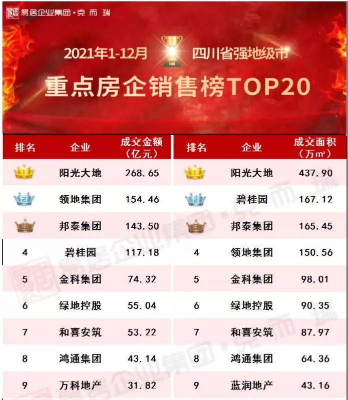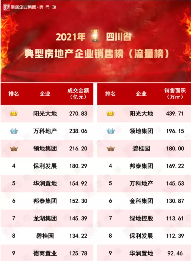 2020年的克爾瑞銷售榜顯示,陽光大地以280.35億元的銷售額,擠到了四川第二的位置,銷售面積則為第一。