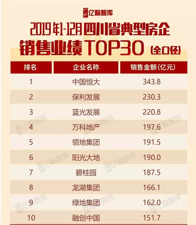 億翰智庫發(fā)布的《2019年1-12月四川省典型房企銷售業(yè)績TOP30(全口徑)》顯示,當年陽光大地在四川的銷售額為190億元,只位居第六位,排在恒大、保利、藍光、萬科、領地之后。
