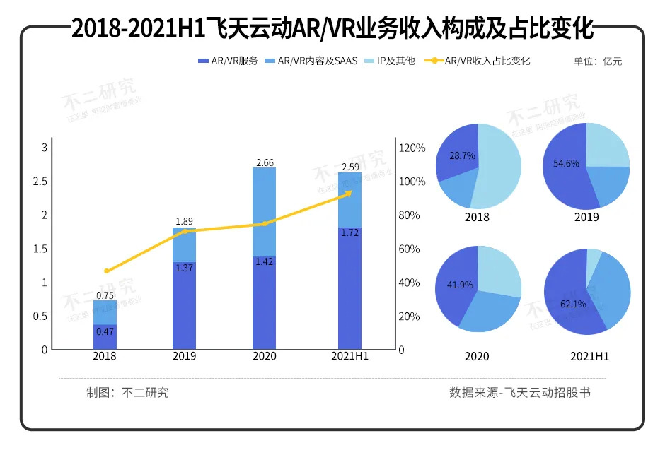 2018-2020年及2021上半年,來自AR/VR服務的收入為4710.2萬元、13710.3萬元、14170.1萬元及17247.9萬元,當期營收占比28.7%、54.6%、41.9%及62.1%。