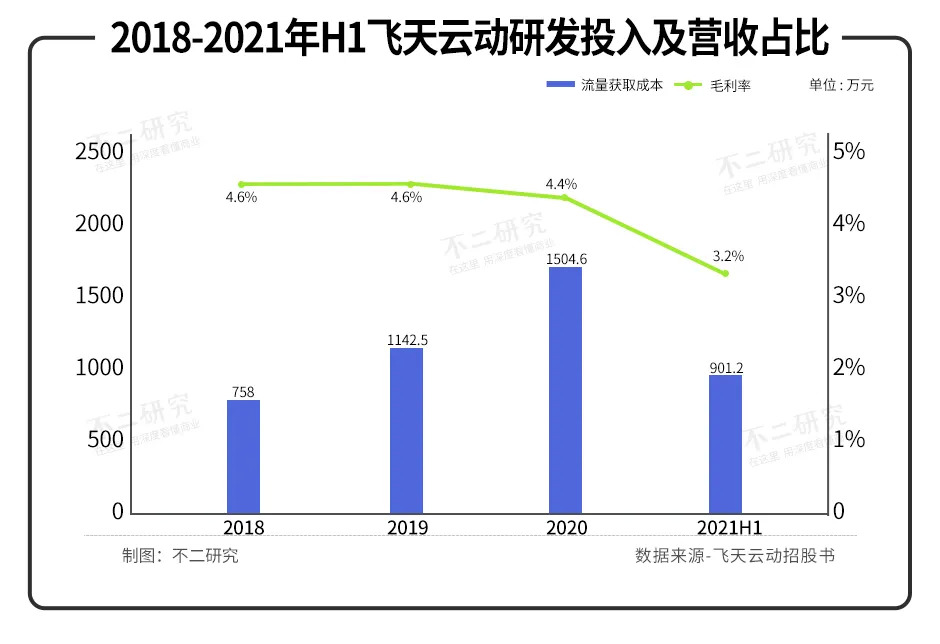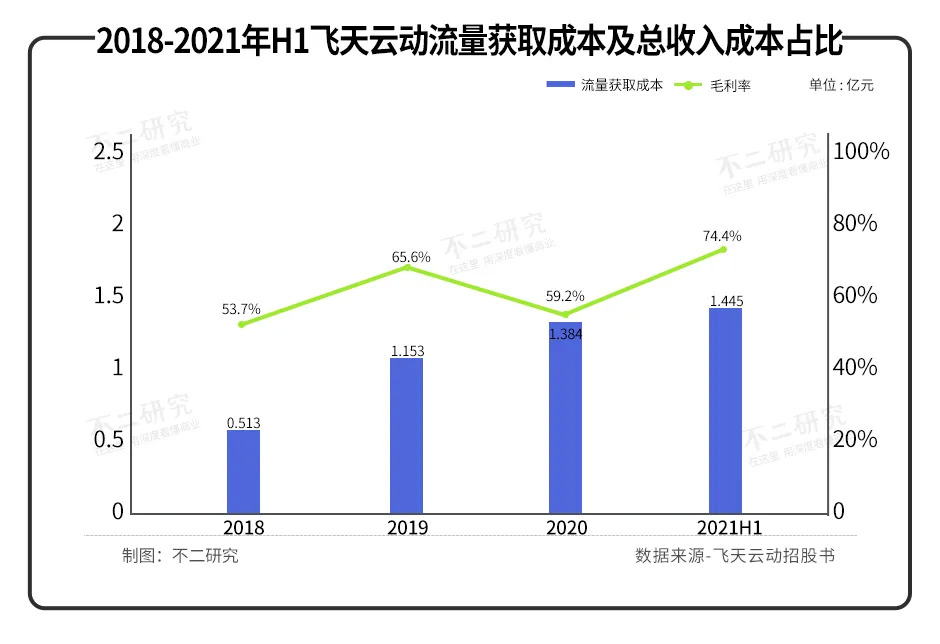 據(jù)招股書披露,2018-2020年及2021上半年,飛天云動的流量獲取成本分別為0.513億元、1.153億元、1.384億元、1.445億元,同期總收入成本占比高達53.7%、65.6%、59.2%、74.4%。