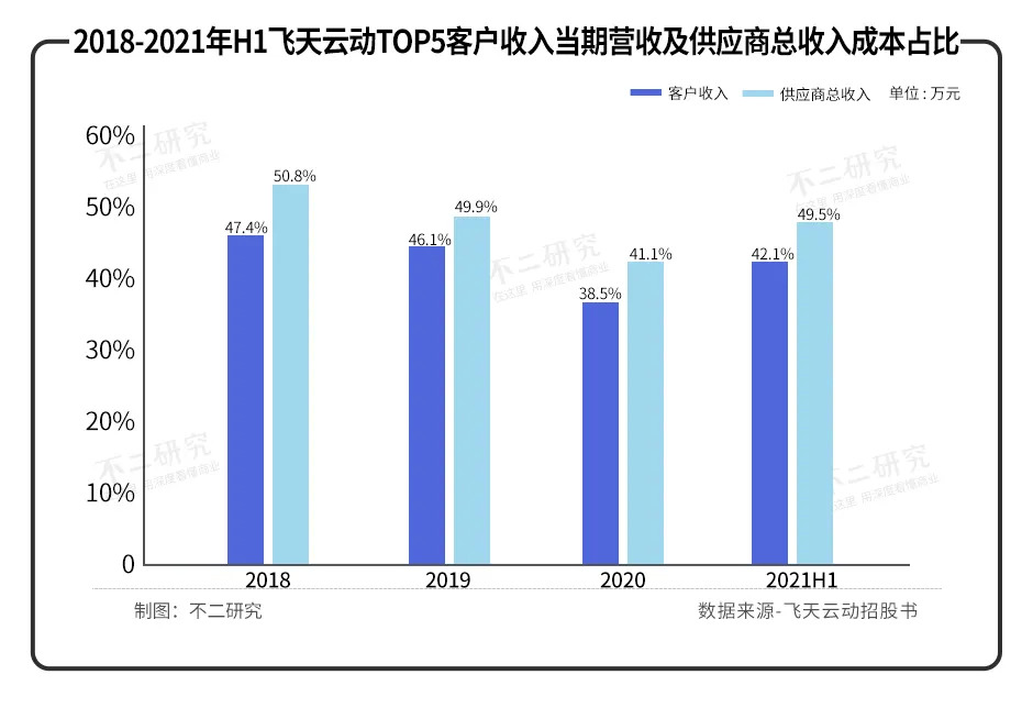 2018-2020年及2021上半年,飛天云動TOP5客戶收入在當期營收占比47.4%、46.1%、38.5%及42.1%;同期,TOP5供應商在總收入成本占比約50.8%、49.9%、41.1%及49.5%。