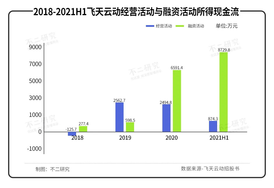 但是,「不二研究」發(fā)現(xiàn),飛天云動經(jīng)營活動所得的現(xiàn)金流卻有起伏:2018-2020年分別為-125.7萬元、2562.7萬元、2494.8萬元;2020年上半年及2021上半年為-1203.3萬元、874.3萬元。