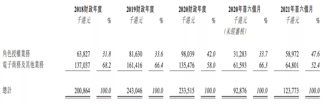 一個(gè)有趣的現(xiàn)象是,小黃鴨的IP授權(quán)業(yè)務(wù)收入占比已經(jīng)從2018財(cái)年的31.8%,一路增長(zhǎng)至2021財(cái)年上半年的47.6%,與周邊產(chǎn)品的自行銷售近乎持平,重要性逐漸凸顯。與之相反的是,周邊產(chǎn)品的收入占比在近幾年內(nèi)都處于下滑狀態(tài),2018財(cái)年的占比接近七成,2021財(cái)年上半年,下滑至五成多。
