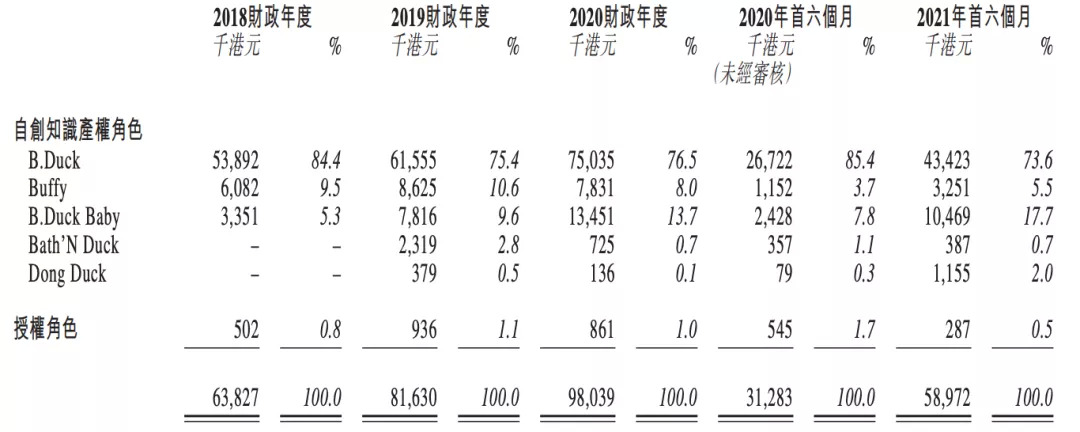 根據(jù)招股書,2018到2020財(cái)年,B.Duck家族占IP授權(quán)業(yè)務(wù)的99.2%、98.9%、99.0%,到2021財(cái)年上半年進(jìn)一步達(dá)到99.5%。而B.Duck家族中,又以B.Duck小黃鴨為核心。