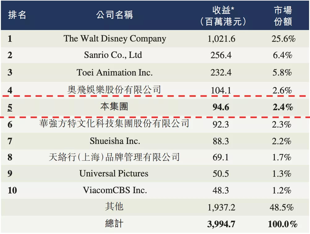 先看IP授權(quán)賽道。從結(jié)果來看,根據(jù)弗若斯特沙利文的報(bào)告,按2020年的角色授權(quán)收益計(jì)算,德盈控股排名第五,市場(chǎng)份額為2.4%,落后于國(guó)內(nèi)玩具廠商奧飛娛樂,與另一位國(guó)內(nèi)游樂園玩家方特文化近乎持平。