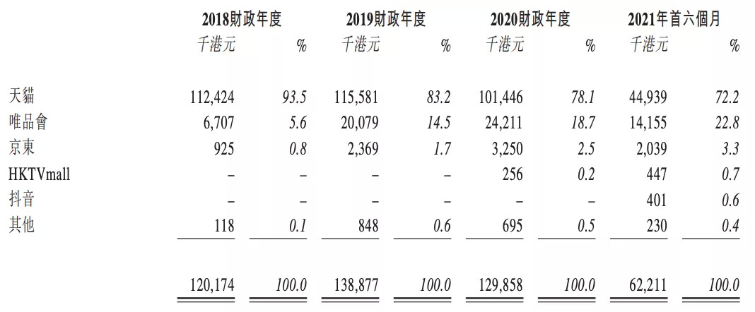 招股書還透露了一個(gè)不好的信息,小黃鴨的主力渠道一直是天貓,截至2021財(cái)年上半年,占比依然超過72%。