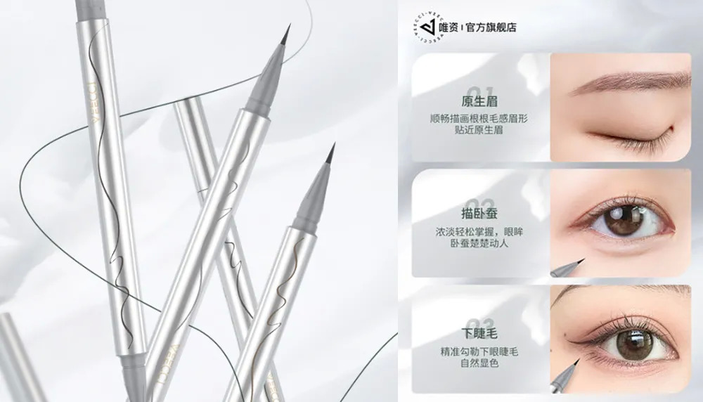 此外,還有部分品牌對(duì)眉筆的質(zhì)地做出調(diào)整,使之兼有眼線筆和臥蠶筆的作用。比如唯資液體眉筆,據(jù)品牌介紹,液體質(zhì)地相較于傳統(tǒng)的粉狀、膏狀眉筆更加順滑,可以用于眼線的勾勒和下睫毛的描畫(huà)。目前,這款液體眉筆在品牌官方天貓旗艦店的月銷量達(dá)4000+。