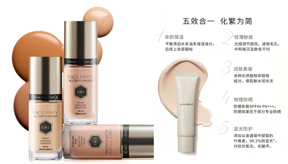 在底妝中,多功能的趨勢(shì)主要體現(xiàn)在粉底液這個(gè)品類上,且有兩個(gè)方向。一是和底妝大類中的其他品類進(jìn)行融合,比如蜜絲佛陀三合一粉底液,就將妝前乳、遮瑕膏和粉底液三種單品集合于一瓶,同時(shí)具有SPF20的防曬作用。再如,日本有機(jī)孕婦彩妝品牌natureglace的五合一素顏霜,則集合了妝前保濕、粉底、潤(rùn)膚、防曬和防藍(lán)光五種作用。